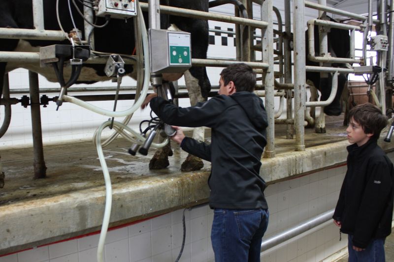 Here’s Carson attaching a milker at the Berger Dairy. Both boys jumped right in. It was very cool to see the process up close.