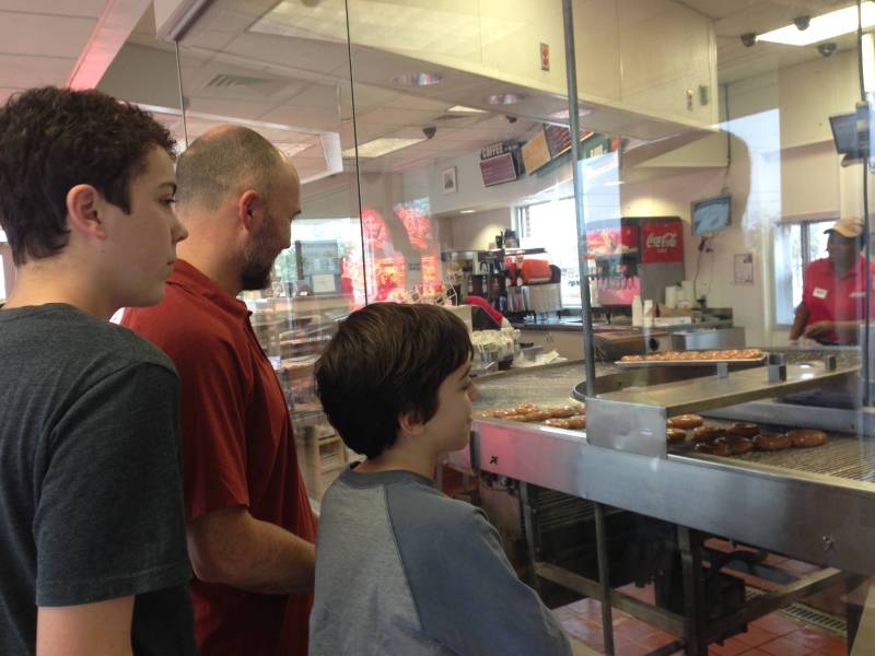 Watching the donut line at Krispy Kreme. Nothing like warm, glazed donuts!