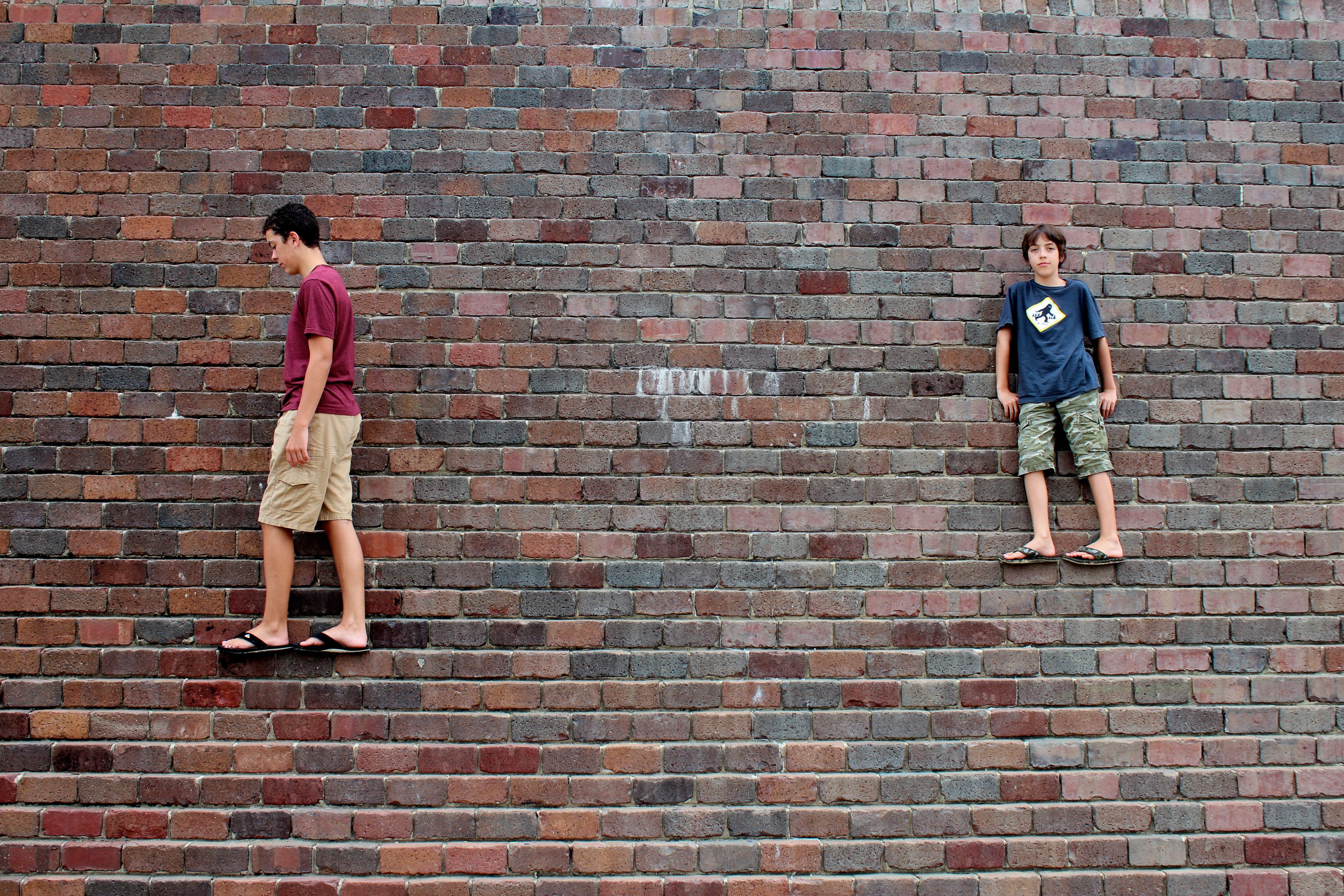 Carson and Bridger climbing on a wall near the levee in Baton Rouge.