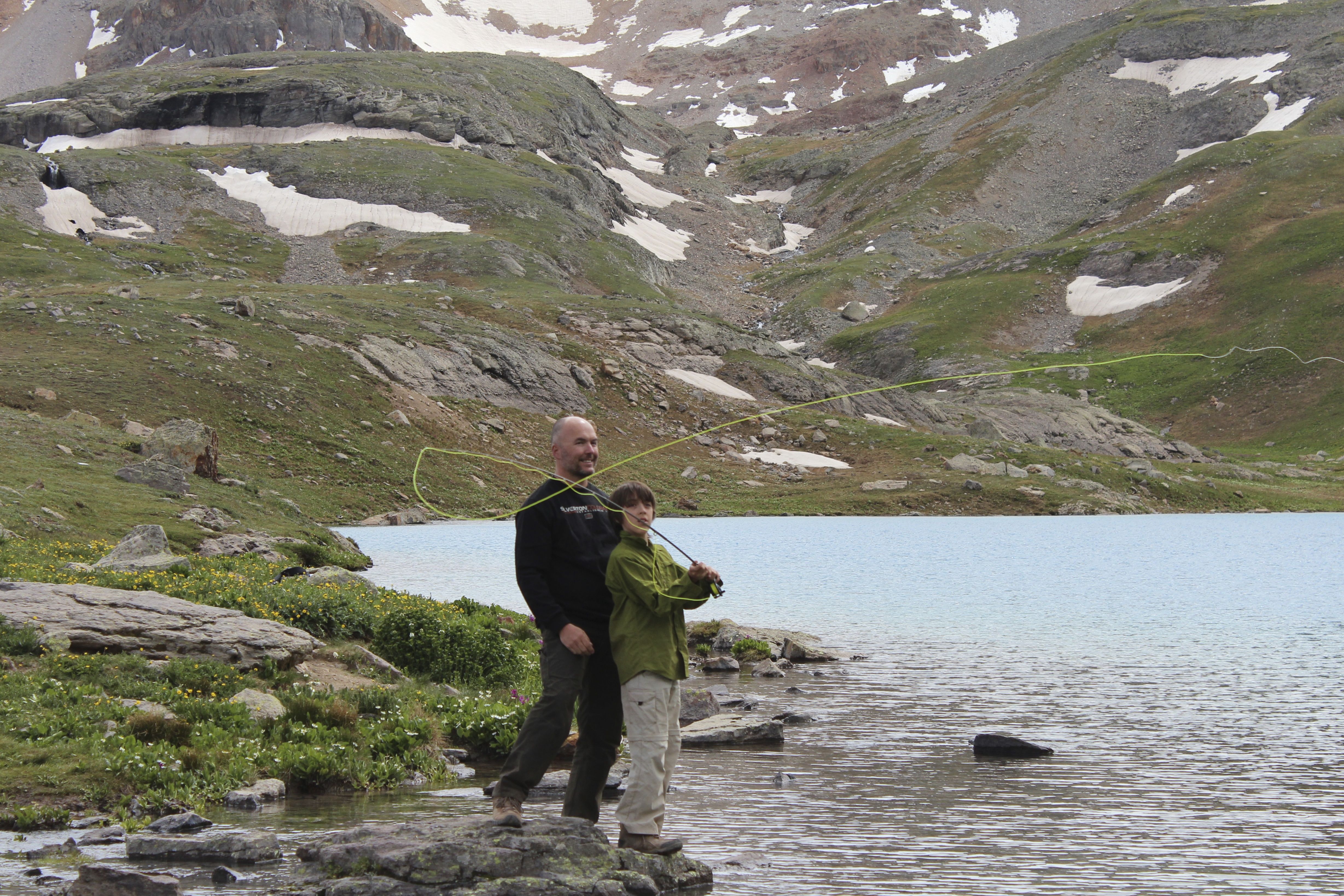 Bridger getting a fly fishing lesson from his dad.