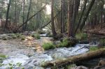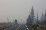 We left the Umpqua River, the hot tub, the well-kicked can, and the LeMert family, heading south toward California with no clear destination for the night. It would take about three days of solid driving, according to Google Maps and Moneypenny (our nickname for the GPS), so we were planning to just get as far as possible each day. For Thursday, that ended up being a National Forest campground on Hat Creek, just on the edge of Lassen National Park. We stopped at about 11 p.m. and backed the bus into the first available spot, earning kudos the next morning from the campground host in an adjacent spot – “Nice parking job last night!” Ayrril smelled smoke but chalked it up to campfires until it lasted until morning. A forest fire was burning inside the park and we ended up driving through some heavy smoke as we came down off the mountain.