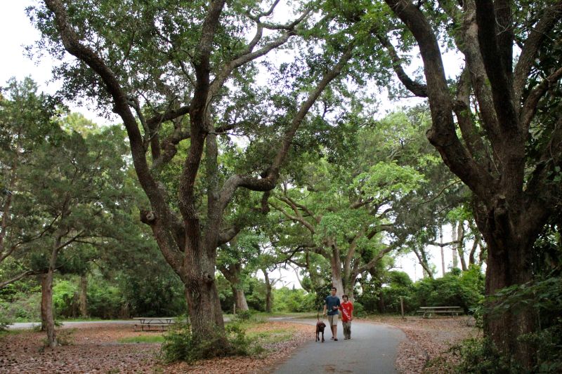The boys walking Sam through the campground. Look at those beautiful trees!